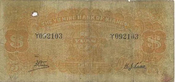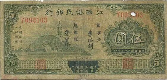 Home > World Banknotes > Asian Banknotes > China > China 5 Dollars Pagode - The Yu Mine Bank of Kiangsi - 1933