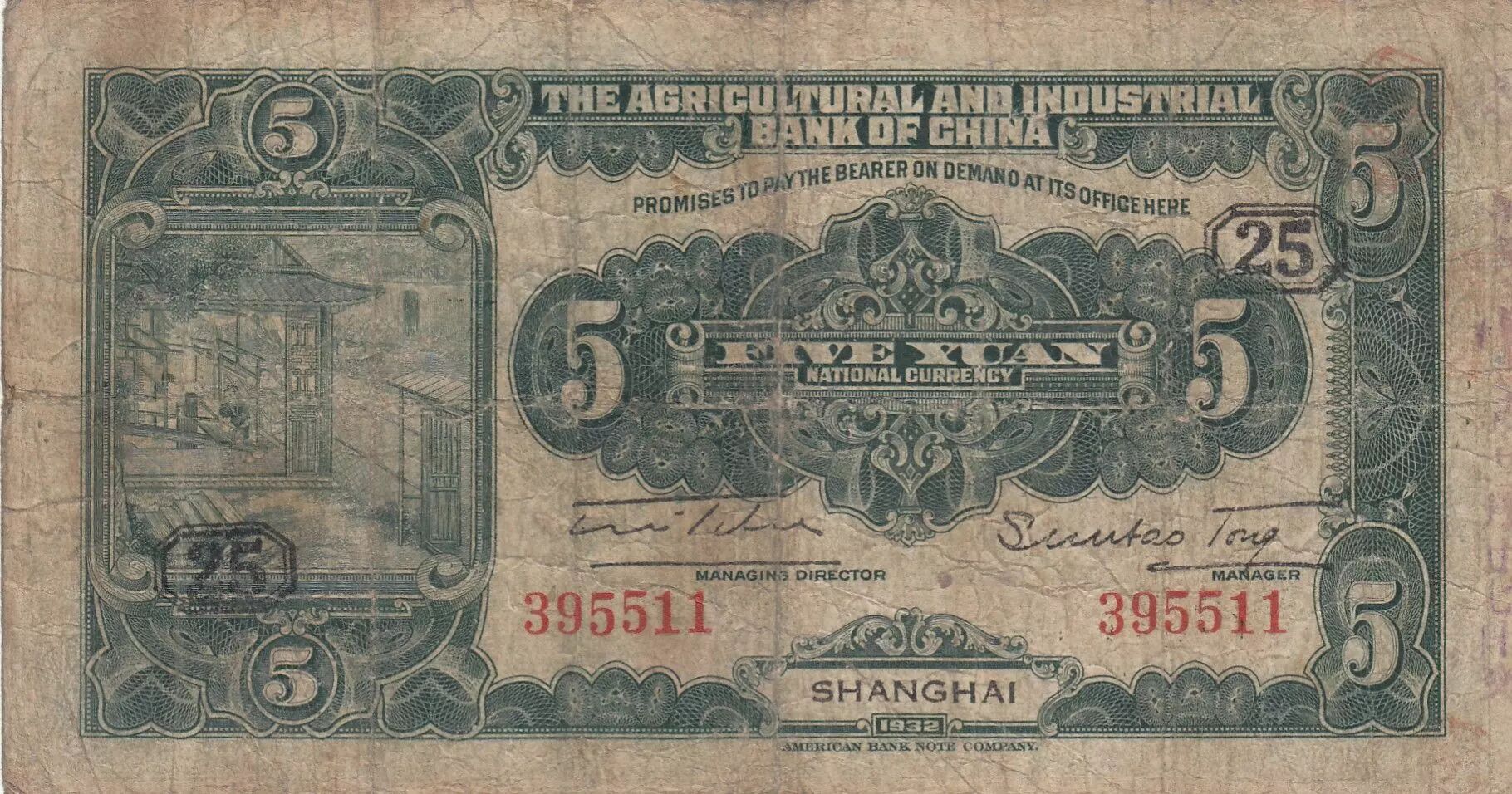 Banknote China 5 Yuan - Agricultural and Industrial Bank of China - 1932 - Serial 395511