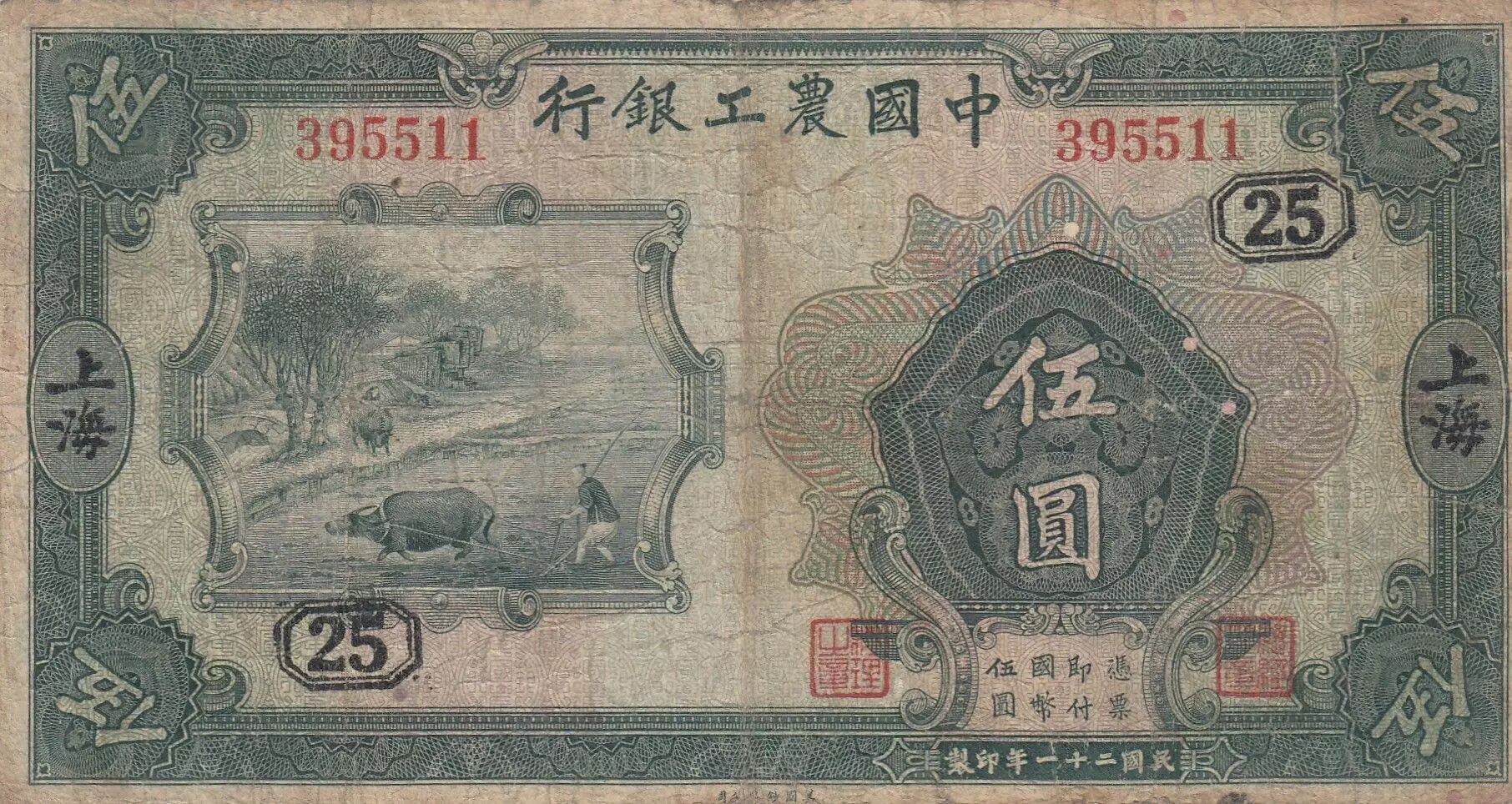 Home > World Banknotes > Asian Banknotes > China > China 5 Yuan - Agricultural and Industrial Bank of China - 1932 - Serial 395511
