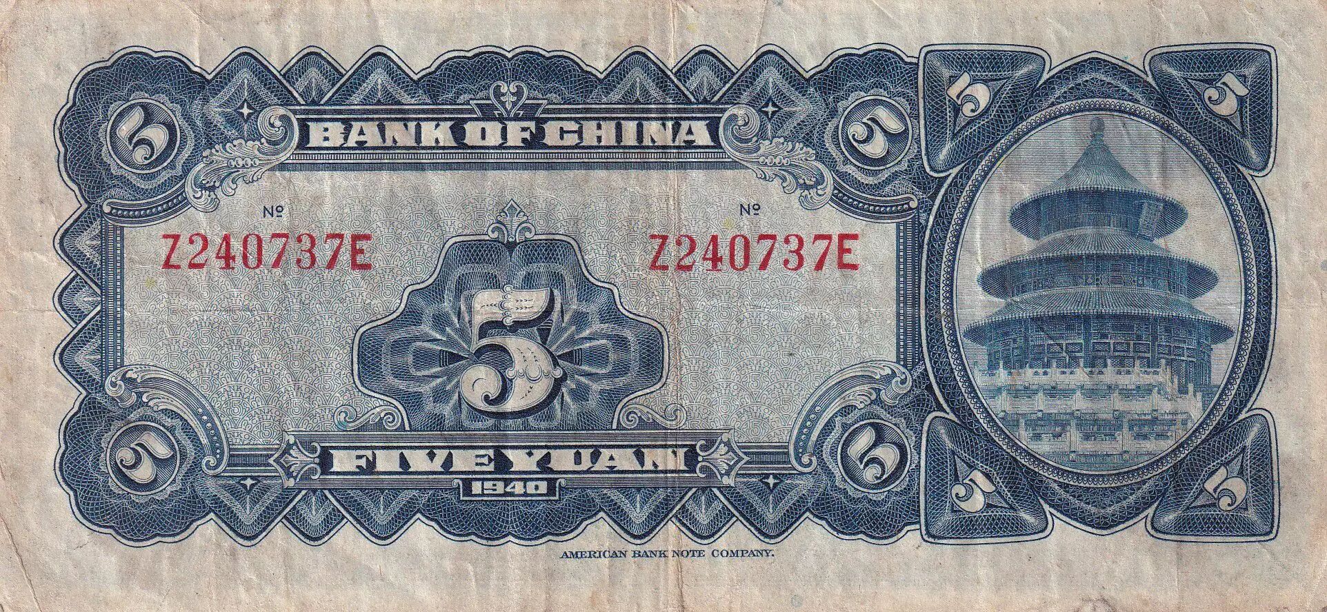 Banknote China 5 Yuan - Sun Yat-Sen - Palace - 1940 - Serial Z - F - P.84