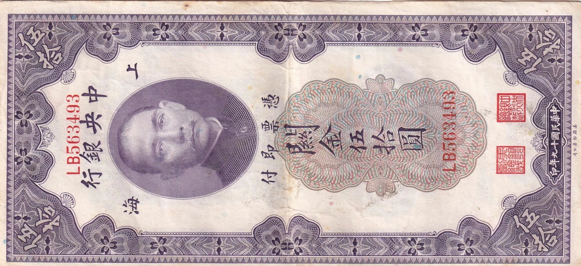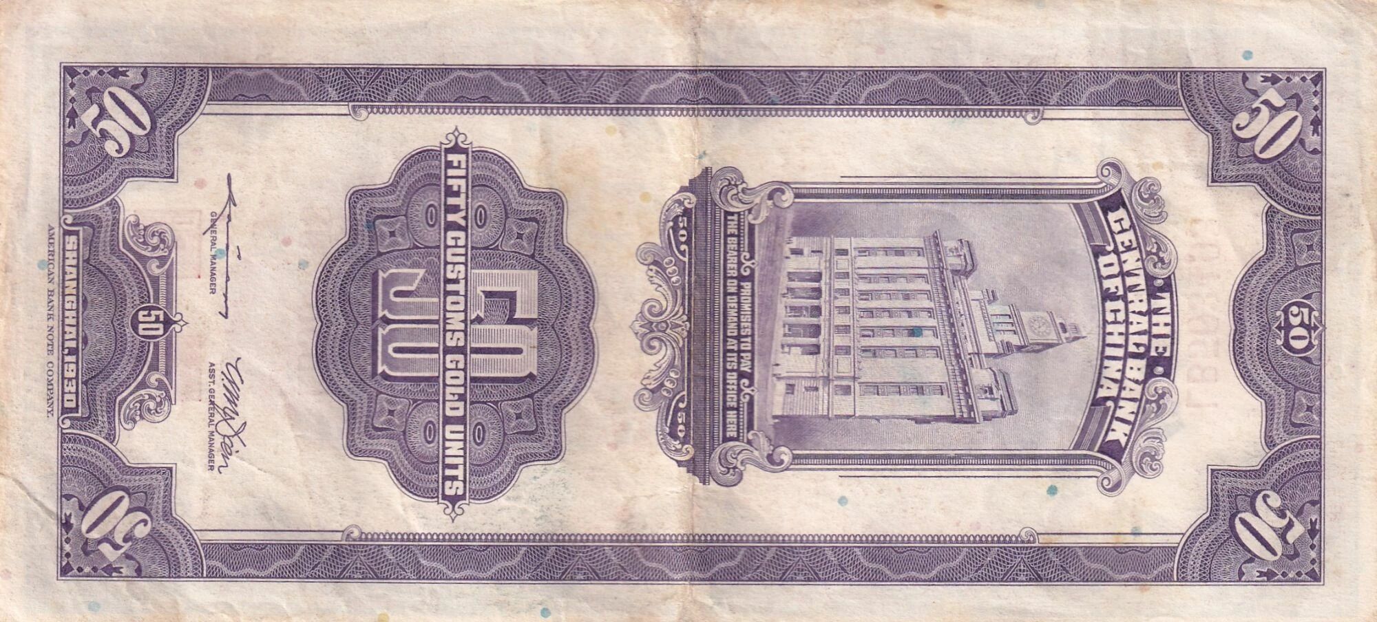 The 50 Customs Gold Units banknote issued in 1930 featuring Sun Yat-Sen (LB series) belongs to the fiduciary issues of Republican China, amidst a context of monetary modernization and severe economic instability.