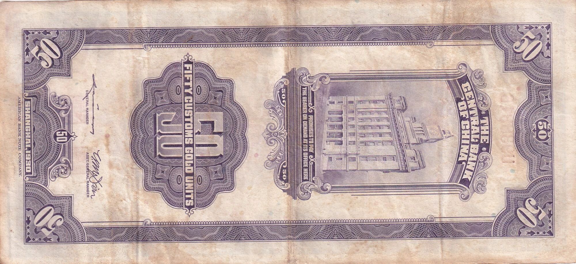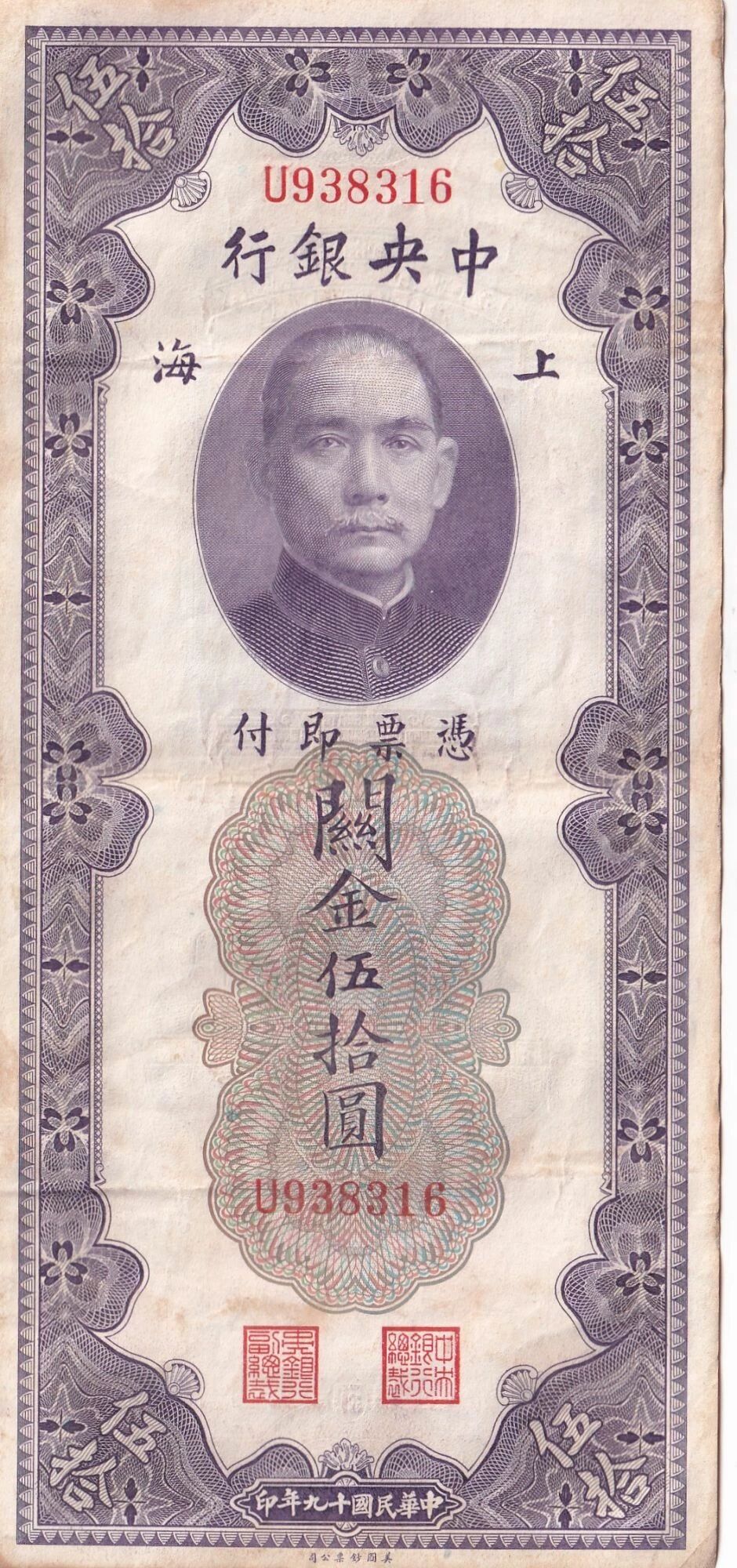 The 50 Customs Gold Units banknote issued in 1930 featuring Sun Yat-Sen (Series U) belongs to the fiduciary issues of Republican China, during a period marked by significant monetary instability and the coexistence of multiple payment systems.