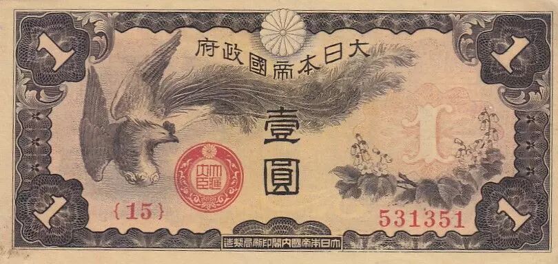 Billet Chine 1 Yen Chine - Occupation Japonaise - Onagadori - 1940 - Bloc 15