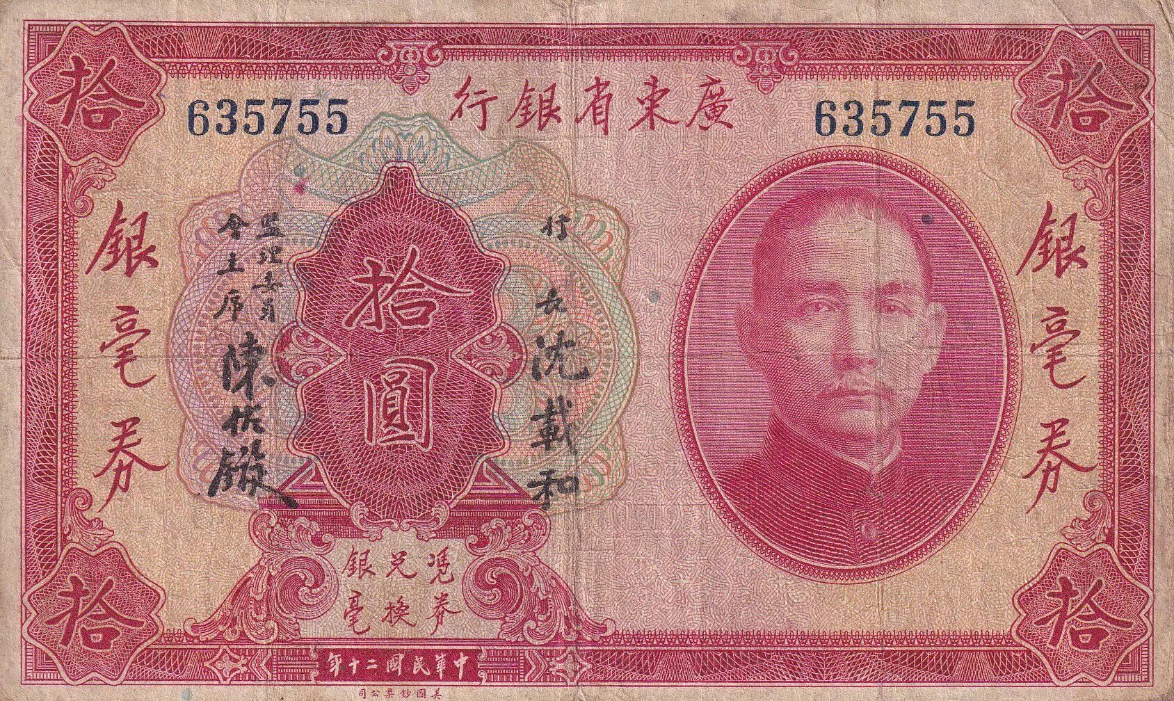 Billet Chine 10 Dollars - Sun Yat -Sen - Kwangtung - 1931 - TB