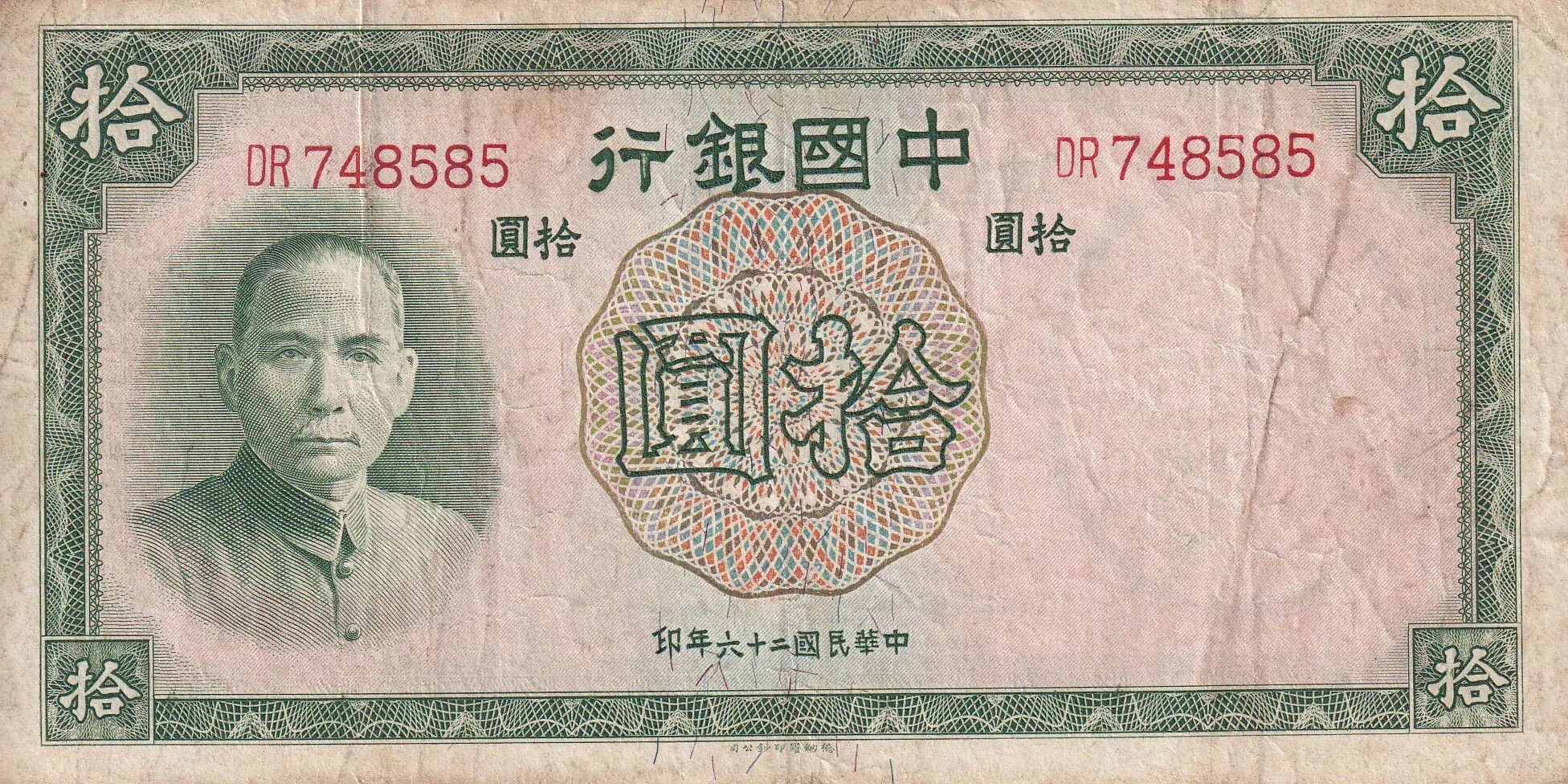 Billet Chine 10 Yuan - Sun Yat-Sen - Bâtiment - 1937 - Série DR - TB - P.81