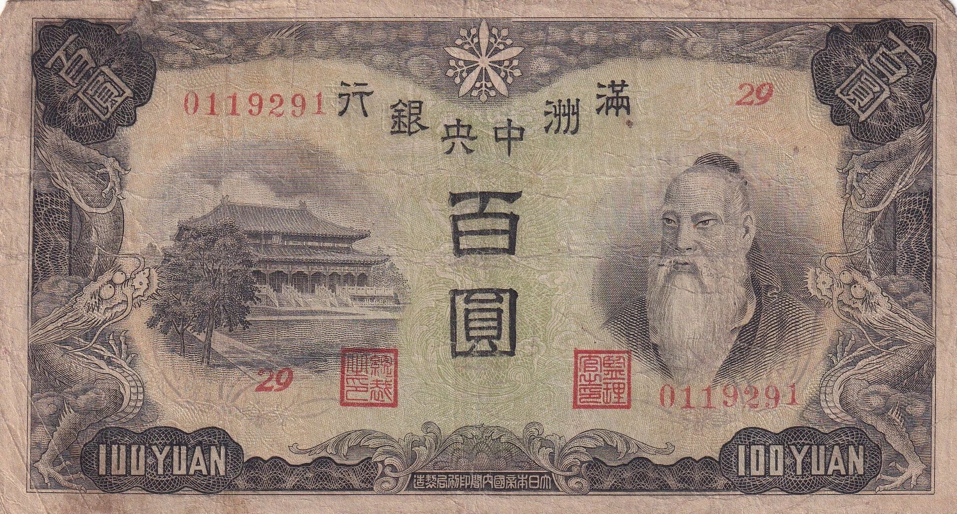 Ce billet de banque, d'une valeur nominale de 100 yuan, a été émis en Chine en 1938. Il appartient à la série "Confucius - Moutons" et est référencé sous le numéro de bloc 29.
