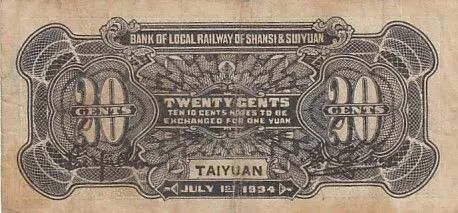 Accueil > Billets du Monde > Billets d'Asie > Chine > Chine 20 cents - Railway of Shansi and Suiyuan - 1934