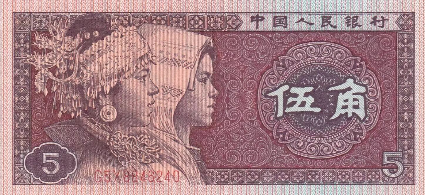 Au recto, le billet met en scène des enfants issus des ethnies Miao et Zhuang, deux groupes ethniques minoritaires de Chine. L'écriture en chinois comprend la mention de la Banque Populaire de Chine (??????) ainsi que la valeur nominale du billet, soit 5 jiao (??). La composition met en avant la diversité culturelle du pays.