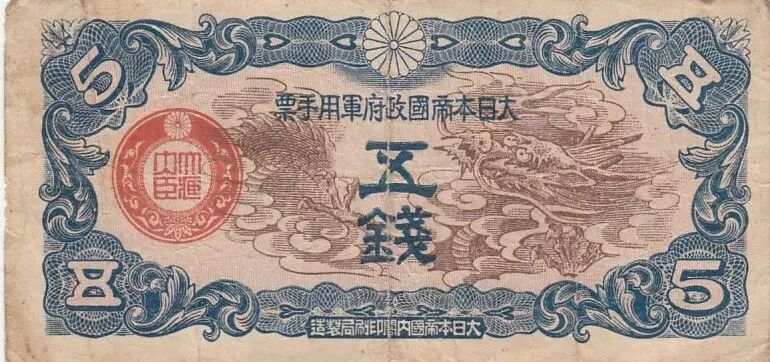 Accueil > Archivage > archivage-Billets du Monde > Chine 5 Sen Chine - Occupation japonaise - Dragon - 1940 - M.9