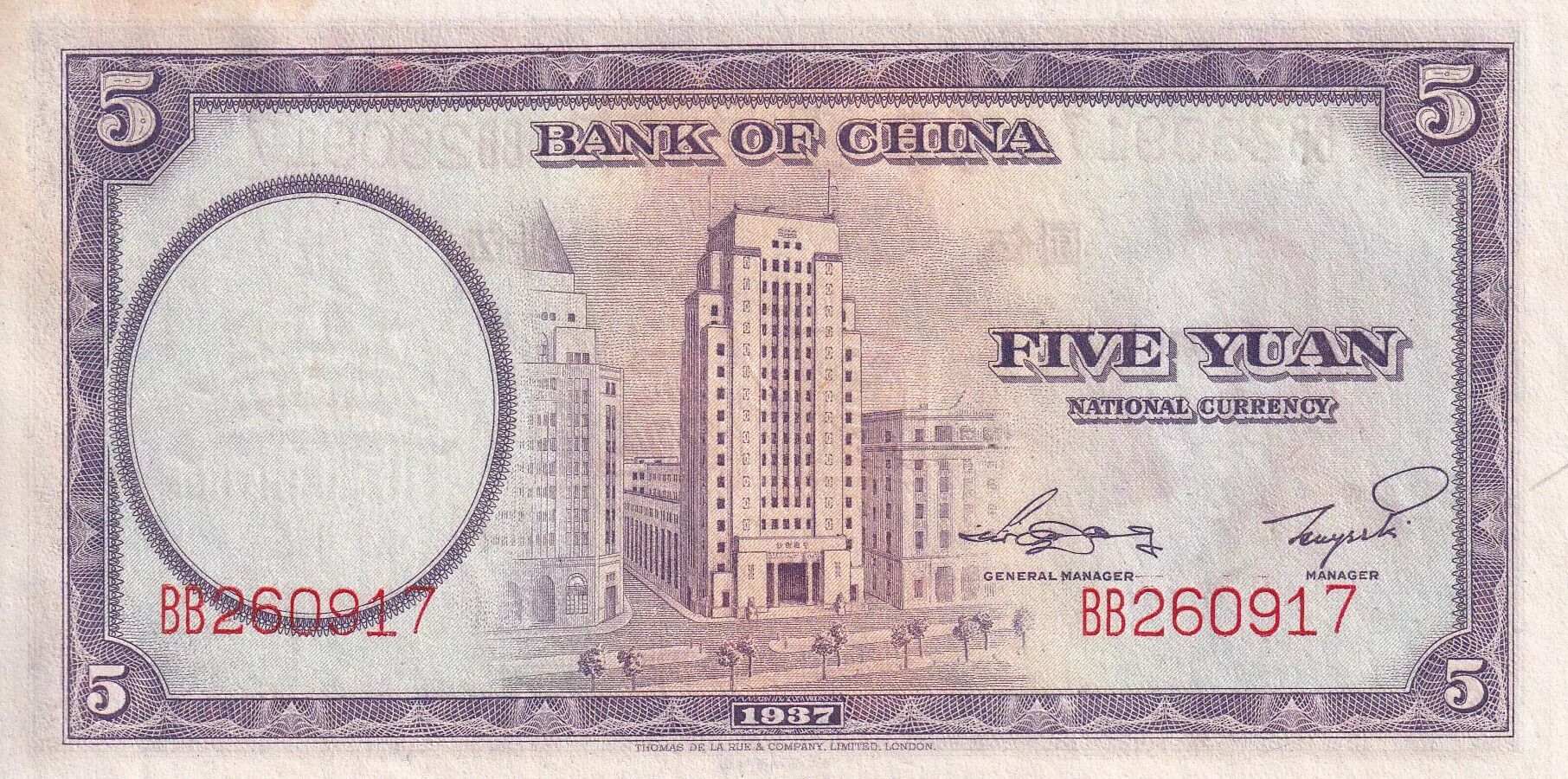 Billet Chine 5 Yuan - Sun Yat-Sen - Bâtiment - 1937 - Série BB - P.NEUF - P.80