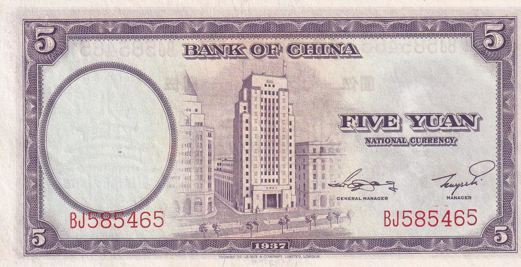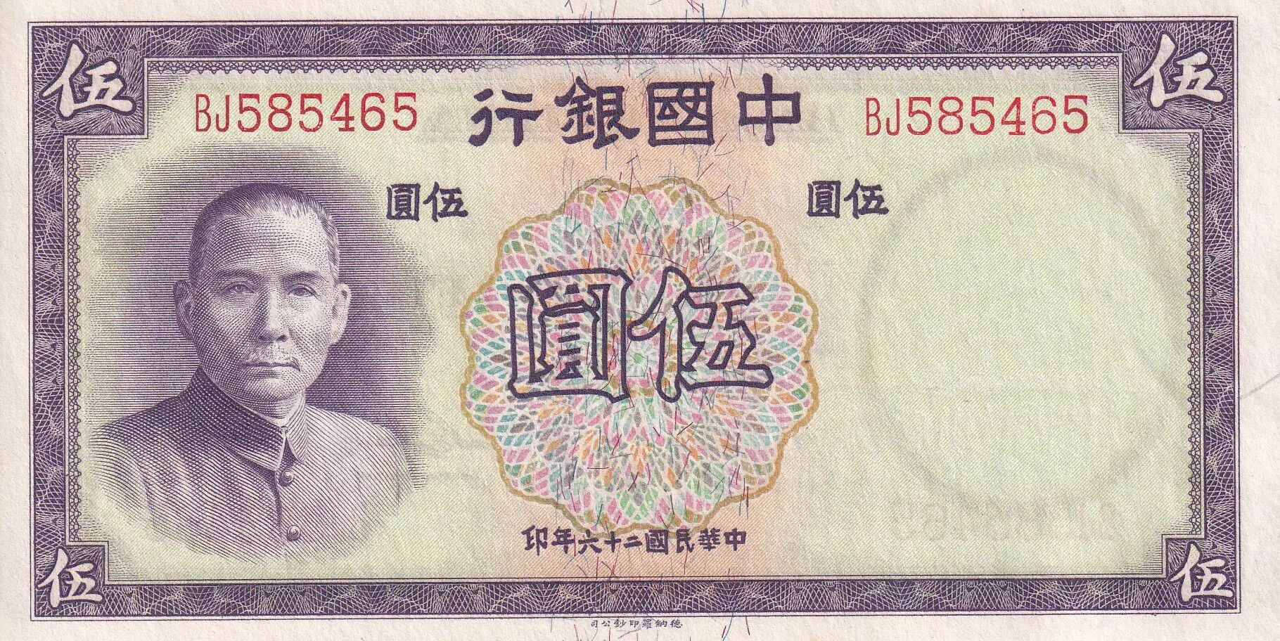 Billet Chine 5 Yuan - Sun Yat-Sen - Bâtiment - 1937 - Série BJ - P.NEUF - P.80