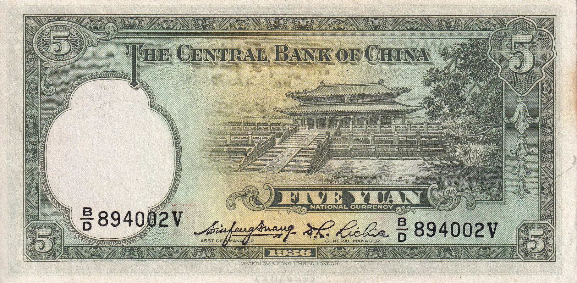 Billet Chine 5 Yuan - Sun Yat-Sen - Cité interdite - 1936 - Série BD - SUP - P.217a