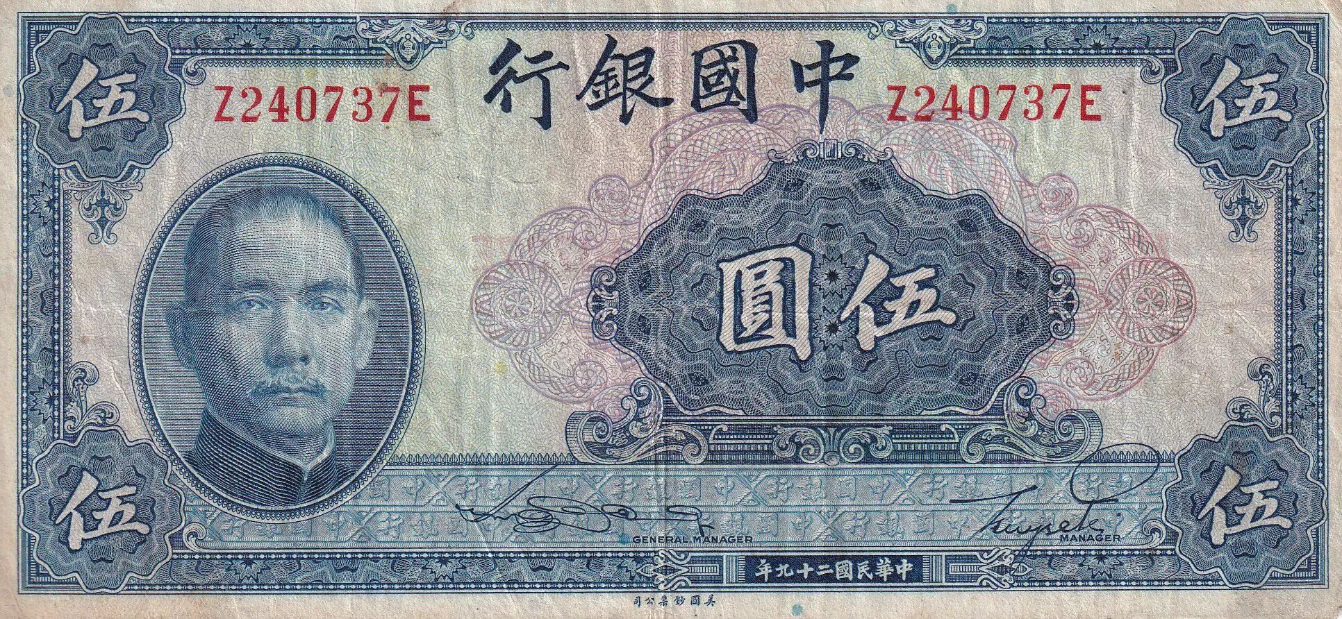 Accueil > Archivage > Chine 5 Yuan - Sun Yat-Sen - Palais - 1940 - Série Z - TB - P.84