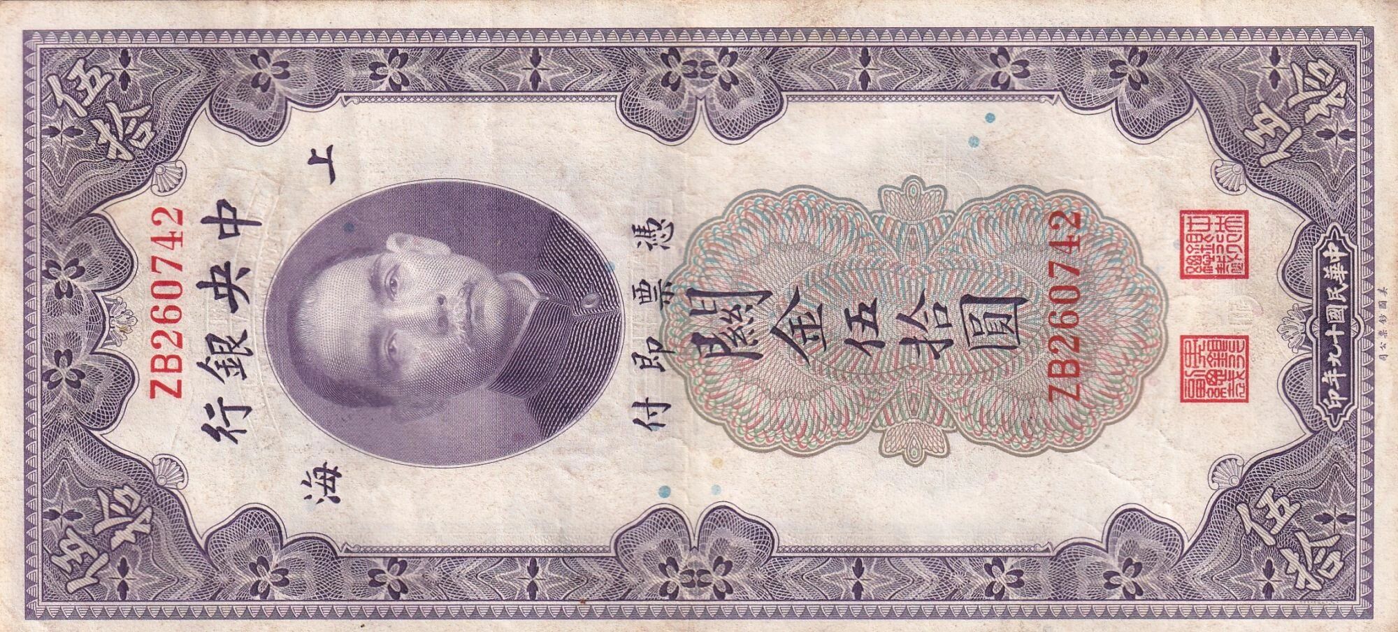 Le billet de 50 Customs Gold Units émis en 1930 à l?effigie de Sun Yat-Sen (série ZB) appartient aux émissions fiduciaires de la Chine républicaine, dans un contexte de réforme monétaire et de recherche de stabilité économique.