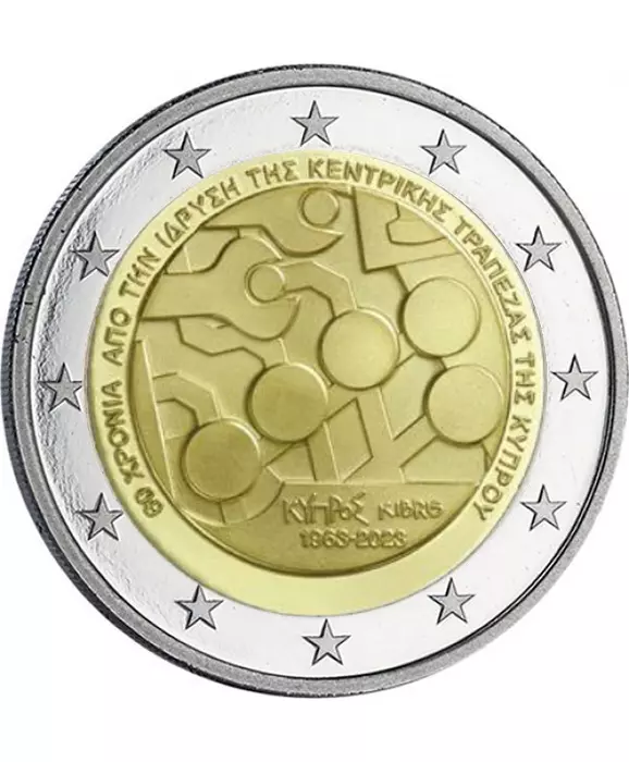 de la Banque Centrale de Chypre. La face nationale de la pièce représente des outils et une puce électronique symbolisant les moyens utilisés par la Banque Centrale à l'ère industrielle et numérique pour assurer la stabilité de l'économie. Le dessinateur est M. George Stamatopoulos et la pièce a été frappée par la Banque de Grèce.