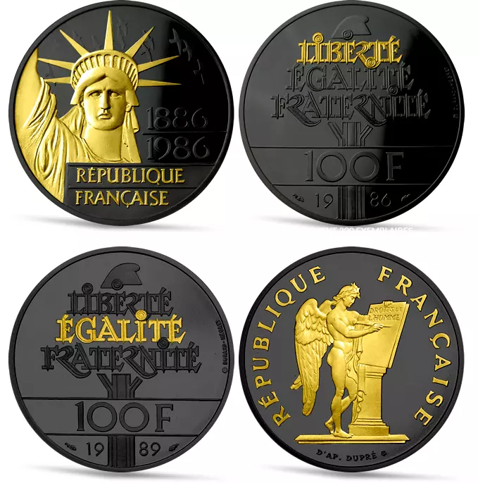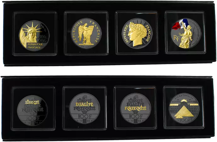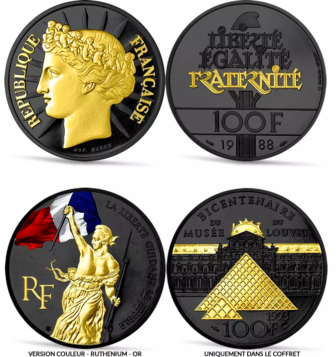 Pièce Coffret Liberté guidant le peuple" RUTHENIUM & OR contenant 4 pièces de 100 francs Argent"