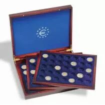 Élégant coffret VOLTERRA pour 105 pièces de 2 euros en capsules. Impression de qualité sur le couvercle et à l'intérieur du couvercle qui est tapissé de satin bleu. 3 plateaux (1 fixe et 2 amovibles) recouverts de feutrine chacun avec 35 cases jusqu'à 32 mm.
