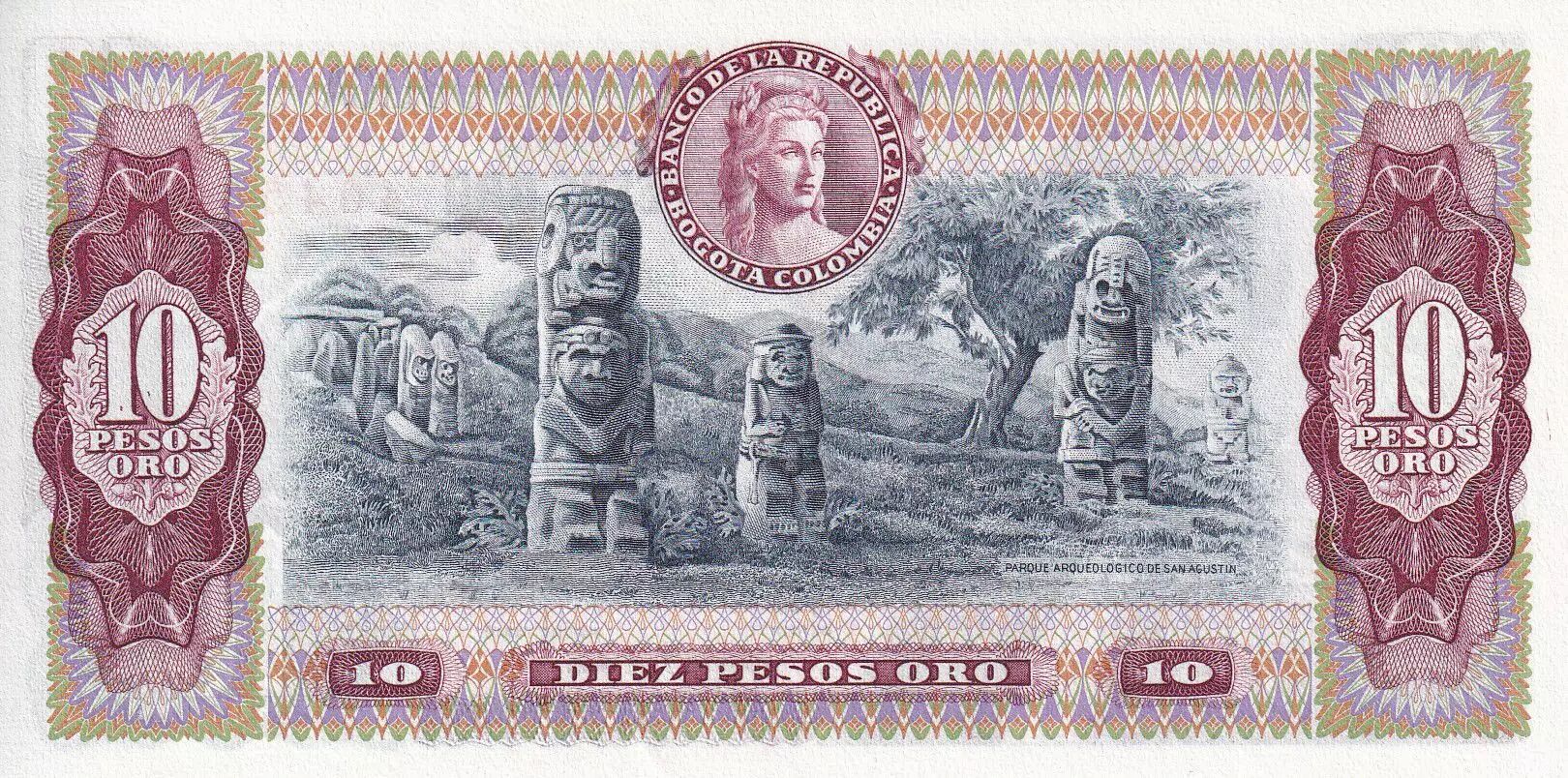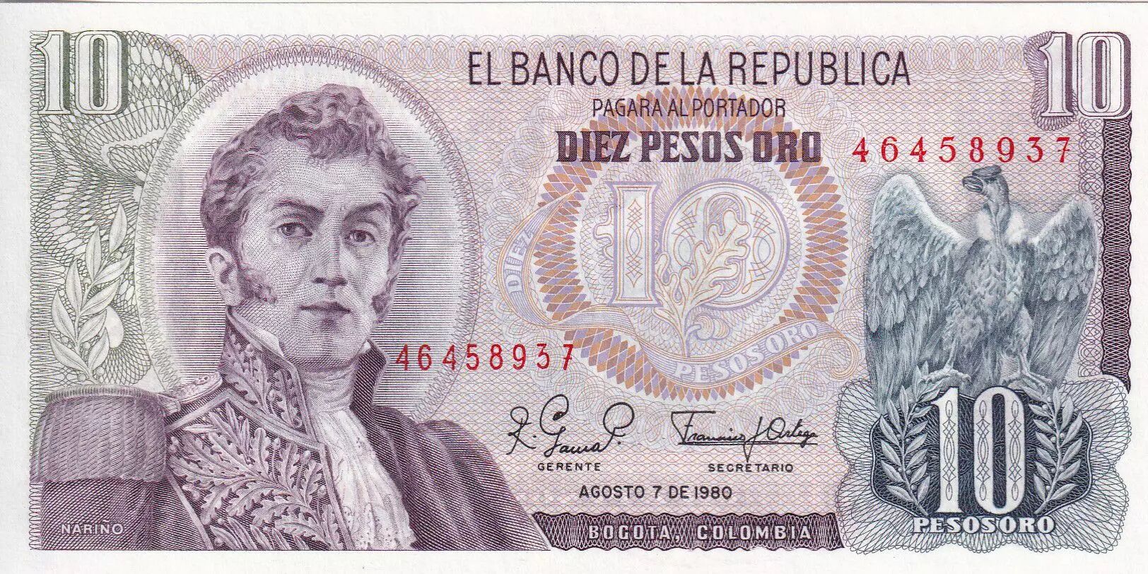 Banknote Colombia 10 Pesos de Oro - A. Narino, condor - Archeological Site - 1980 - P.407g