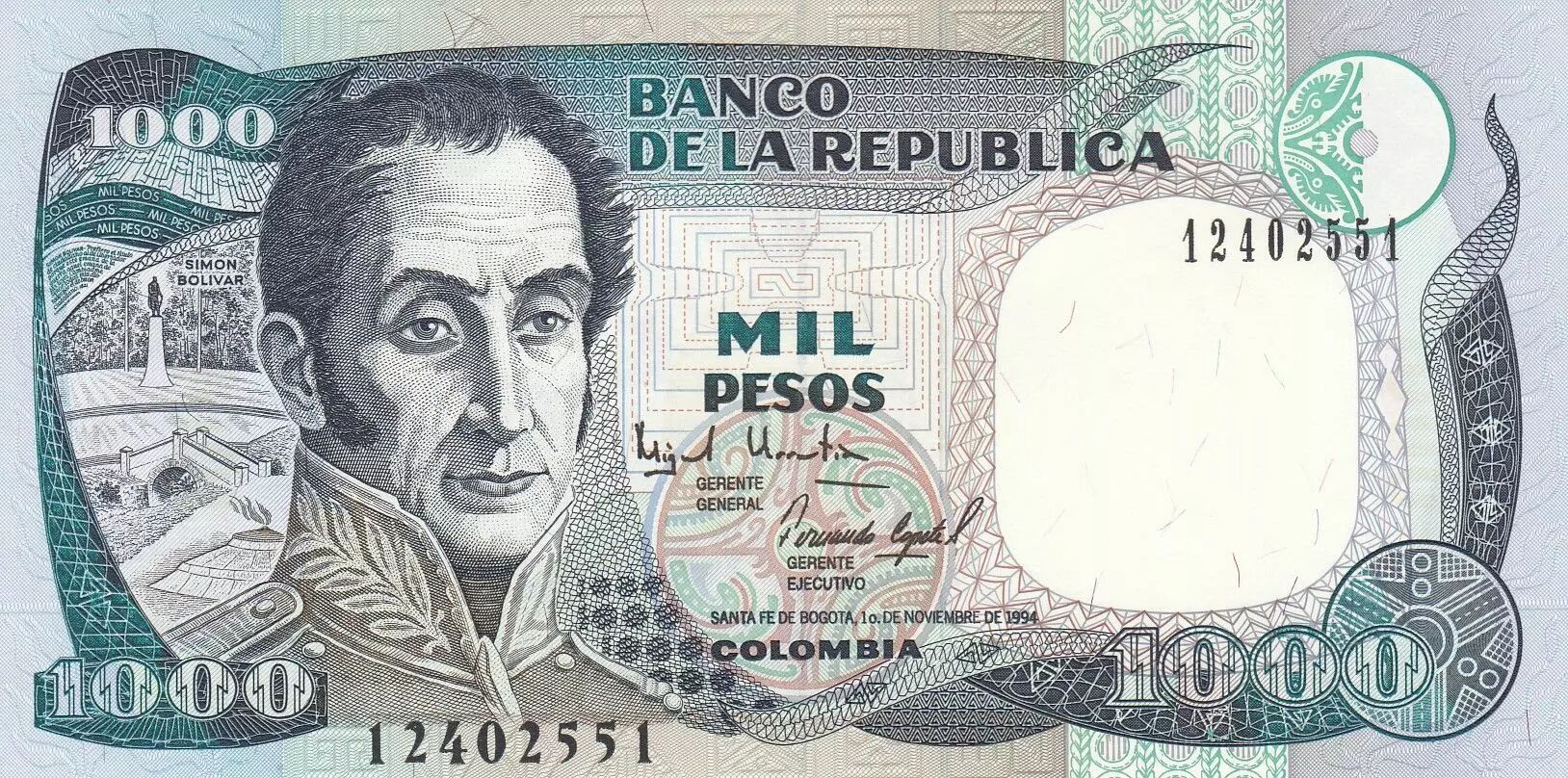 The 1000 Colombian Peso banknote, dated November 1, 1994, is aProduct type: Banknote issued by the issuing institution of Colombia. It is part of Series 1. The face value of this banknote is 1000 pesos.