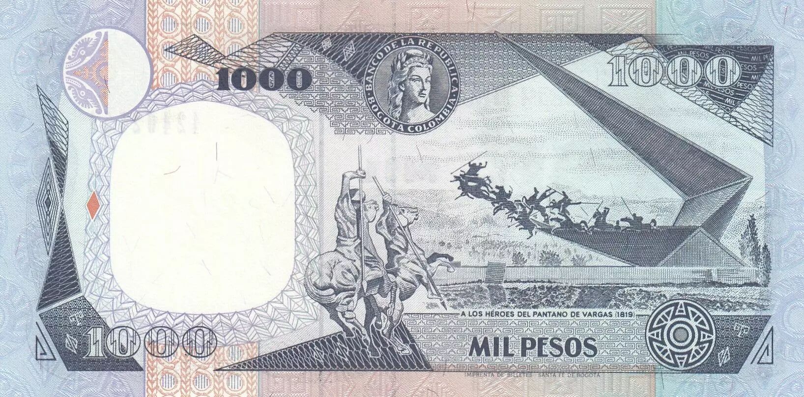 On the back, the banknote presents a representation of a typical Andean landscape of Colombia. This landscape includes imposing mountains and lush vegetation, reflecting the natural richness of the country. Geometric patterns and additional ornaments complement the design, enhancing the overall aesthetic of the banknote. The face value, "1000 PESOS", is clearly indicated in words and numbers.