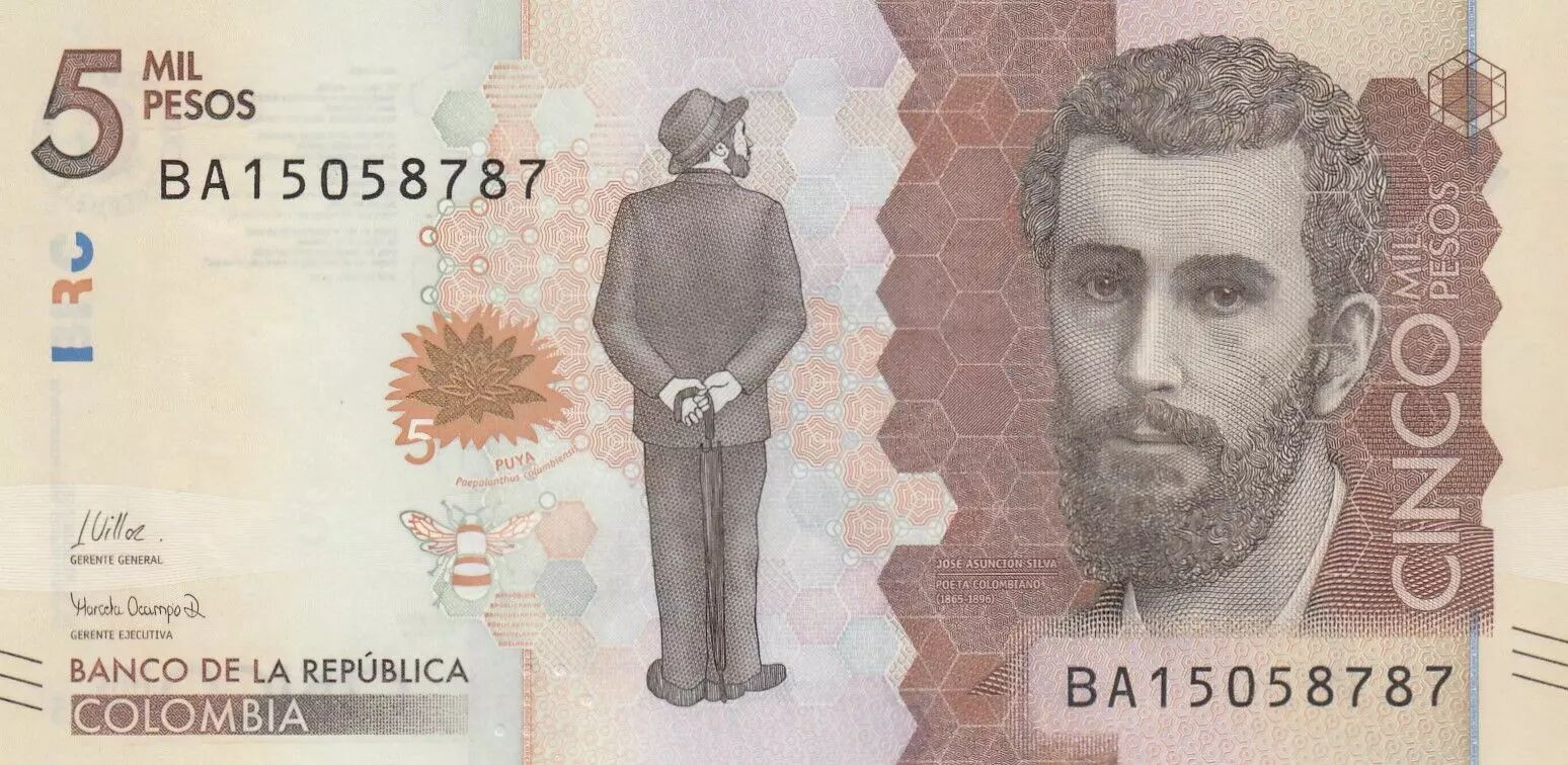 The 5,000 Colombian Peso banknote, issued in 2025, is part of the BA series. It commemorates Jose Silva, an iconic figure whose portrait likely adorns one side of the banknote.