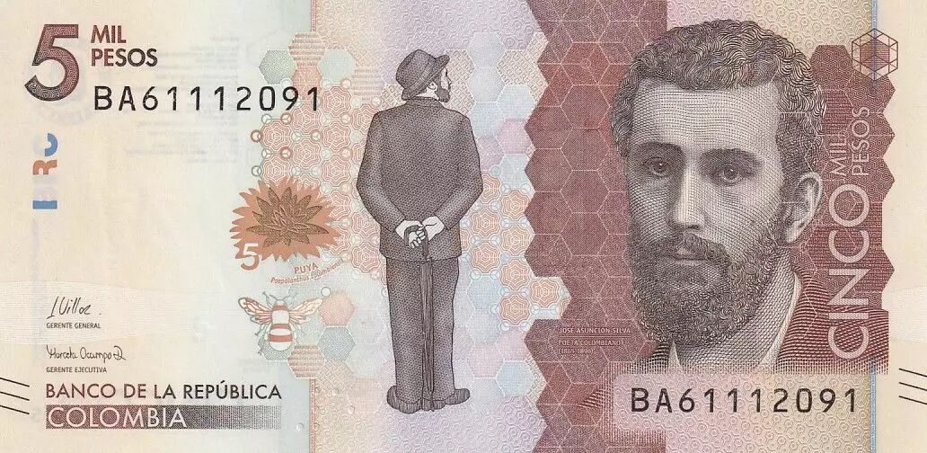 The front of the banknote features the poet José Asunción Silva. He is depicted from the back, at the center of a complex honeycomb pattern, holding an umbrella. His portrait also appears on the right. A Puya-type plant (Paepalanthus columbiensis) and a bee are visible, positioned between the watermark and the figure of the poet. The name of the issuing institution and the country are inscribed in the lower left. The face value is indicated in numerals and letters in the upper left, and vertically, in letters, on the right side. A Braille indication, representing the number five, is present to the right of the country's name.