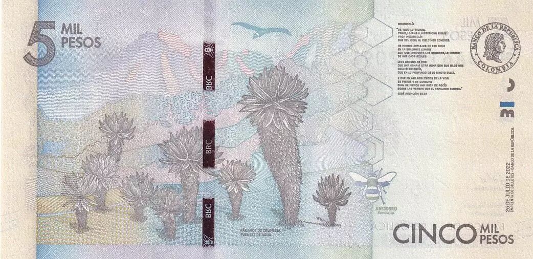 The back of the banknote presents a view of the Andes mountain range, with rivers and high-altitude vegetation. Animals such as a bear, a condor, and a bumblebee can also be seen. An excerpt from the poem "Melancolía" by José Asunción Silva is printed in the upper right, accompanied by the seal of the issuing bank. The face value is repeated in numerals and letters in the upper left and in letters in the lower right.