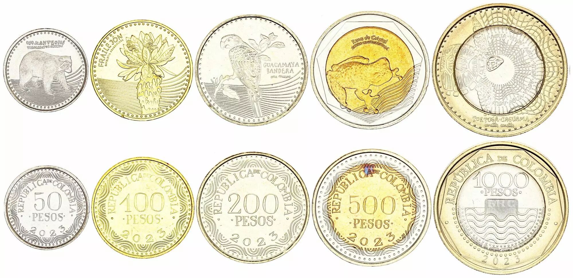 50, 100, 200, 500, and 1000 Pesos. The 500 and 1000 Pesos are bimetallic.