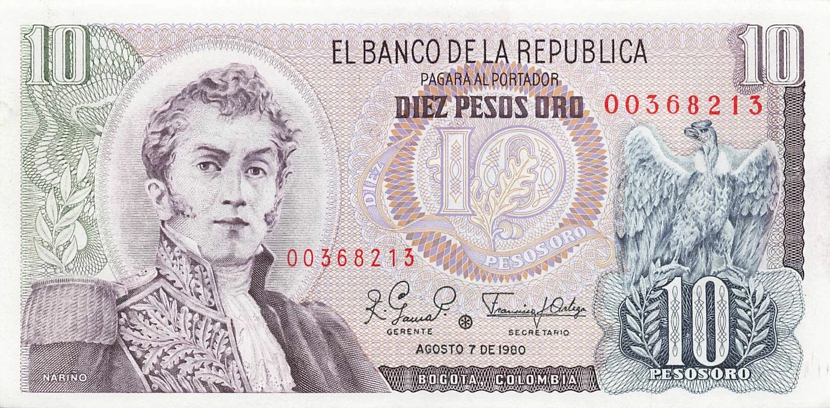 Accueil > Billets du Monde > Billets d'Amérique > Colombie > Colombie 10 Pesos Oro - 1980 - Remplacement - P.407
