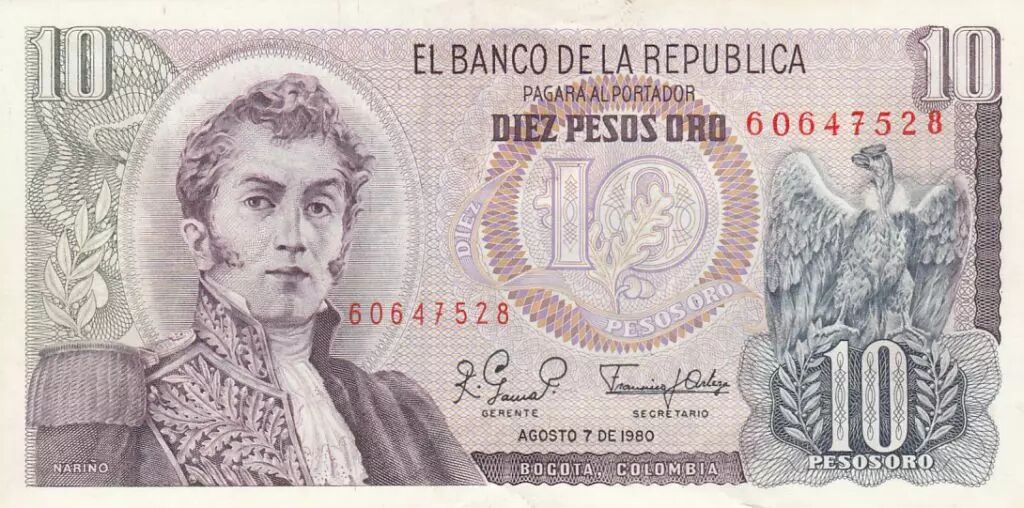 Accueil > Billets du Monde > Billets d'Amérique > Colombie > Colombie 10 Pesos oro ,Général Narino- 07-08-1980 - Série AZ