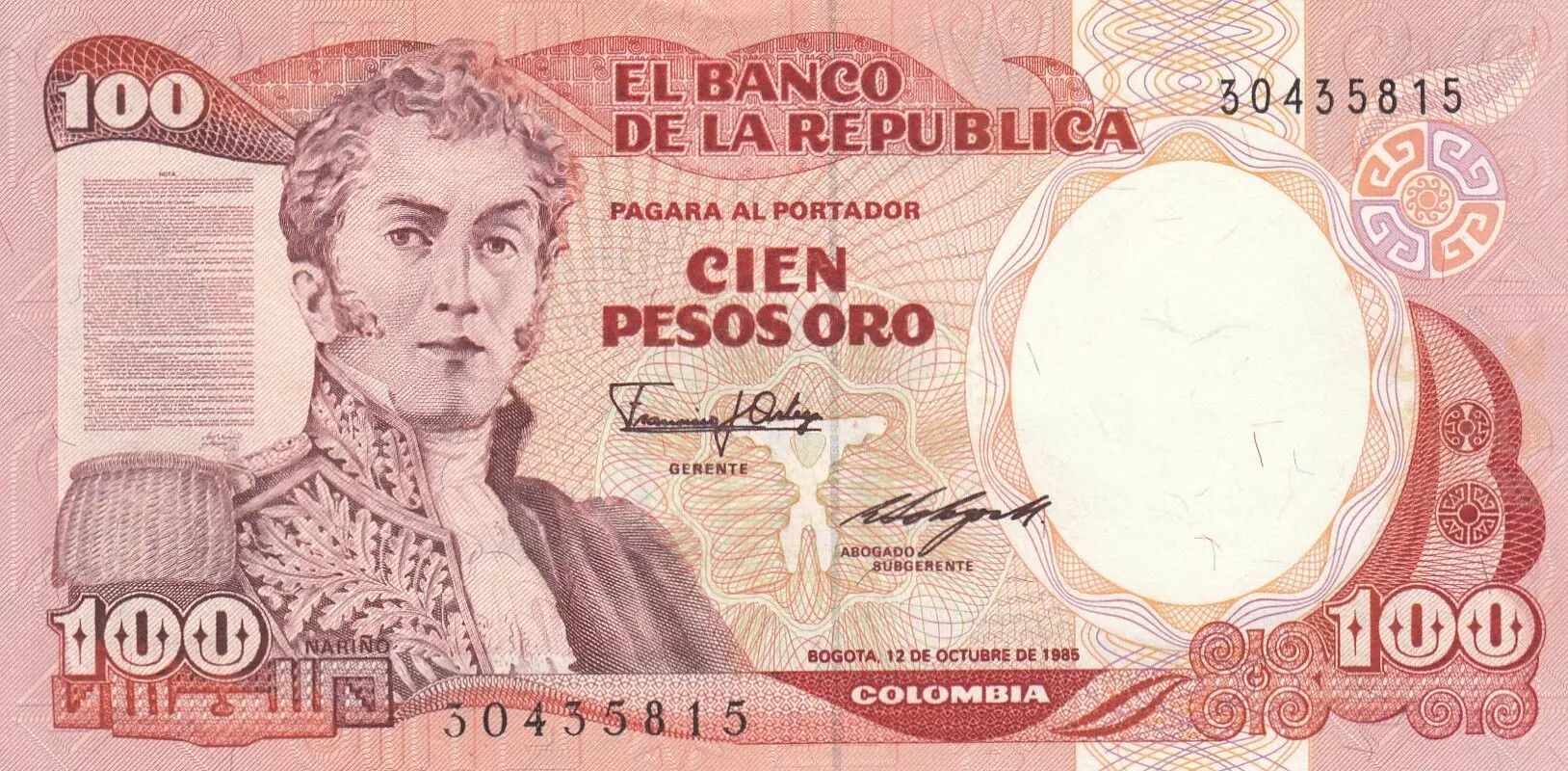 Billet Colombie 100 Pesos Oro, Gal A Narino - 1985