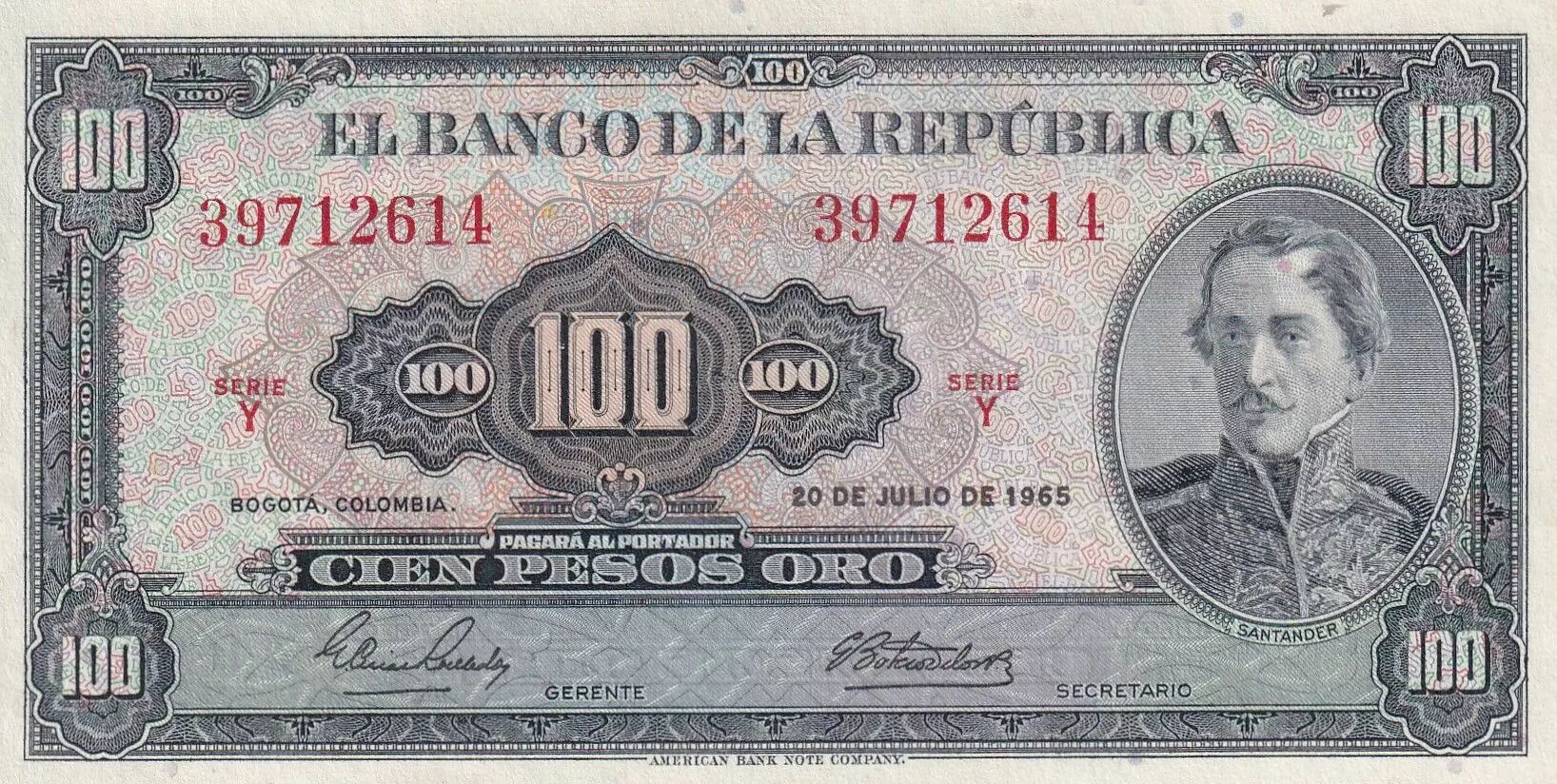 Billet Colombie 100 Pesos Oro - Général Santander - 20-07-1965 - Série Y