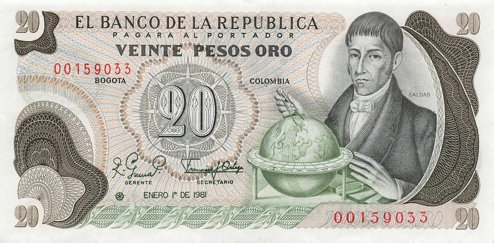 Accueil > Billets du Monde > Billets d'Amérique > Colombie > Colombie 20 Pesos Oro - 1981 - Remplacement - P.409