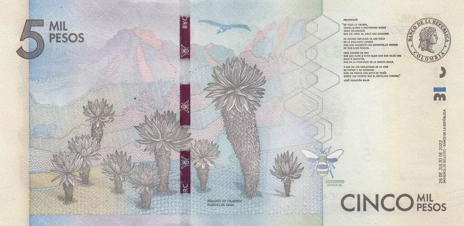 La valeur nominale du billet est de 5 000 pesos, ce qui représente une coupure de moyenne valeur dans le système monétaire colombien. Il est probable que le billet comporte divers éléments de sécurité pour prévenir la contrefaçon, tels que des filigranes, des fils de sécurité, des encres spéciales et des micro-impressions. Ces éléments sont intégrés au design du billet pour garantir son authenticité et protéger contre la falsification.
