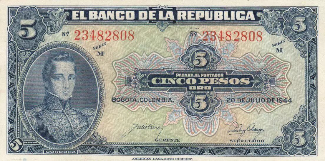 Accueil > Archivage > Colombie 5 Pesos Oro, Gal Cordoba - 1944 - Neuf - P.386c