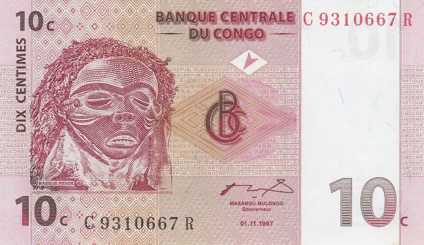 On the obverse, the banknote displays a Pende mask positioned on the left. Inscriptions in Latin identify the issuing institution, namely the Central Bank of Congo, as well as the face value of the banknote, which is "Ten Centimes".
