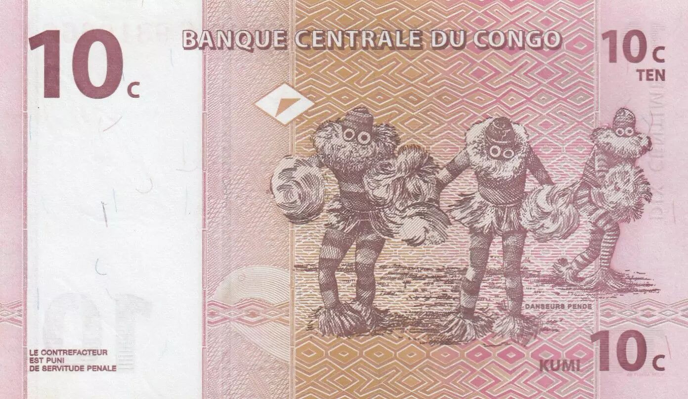The reverse of the banknote depicts Pende dancers, appearing in the center right of the composition. As on the obverse, the mention of the Central Bank of Congo is inscribed in Latin characters.