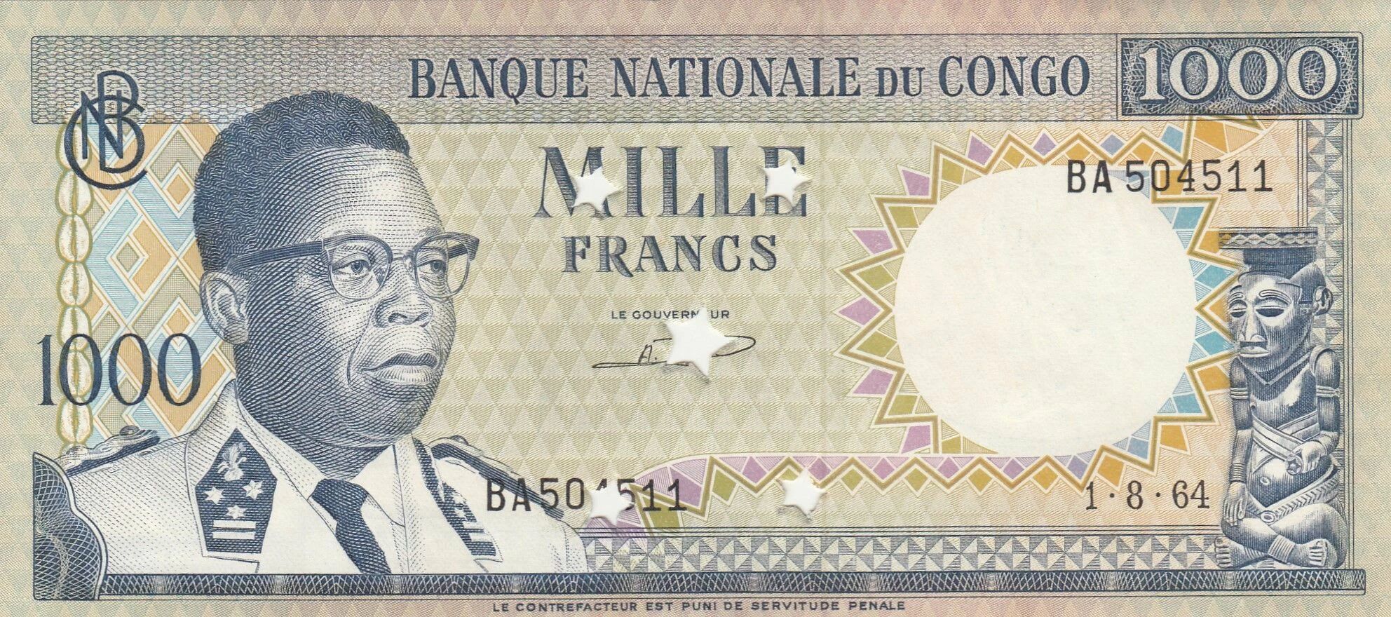 This banknote from the Democratic Republic of Congo has a face value of 1000 francs. It was issued in 1964.