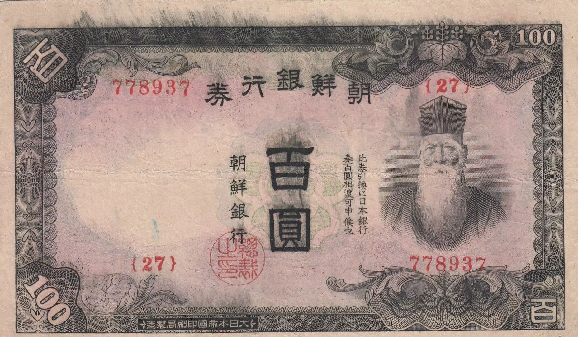 Billet Corée 100 Yen Homme barbu - ND (1944) - Bloc 27