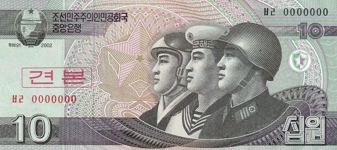 L'avers du billet présente un groupe de trois figures militaires : un pilote, un marin et un soldat, tous orientés vers la gauche. La légende est rédigée en écriture Hangeul, indiquant "République populaire démocratique de Corée, banque centrale" et la valeur nominale de "10 dix wons". Le numéro de série du spécimen est 0000000.