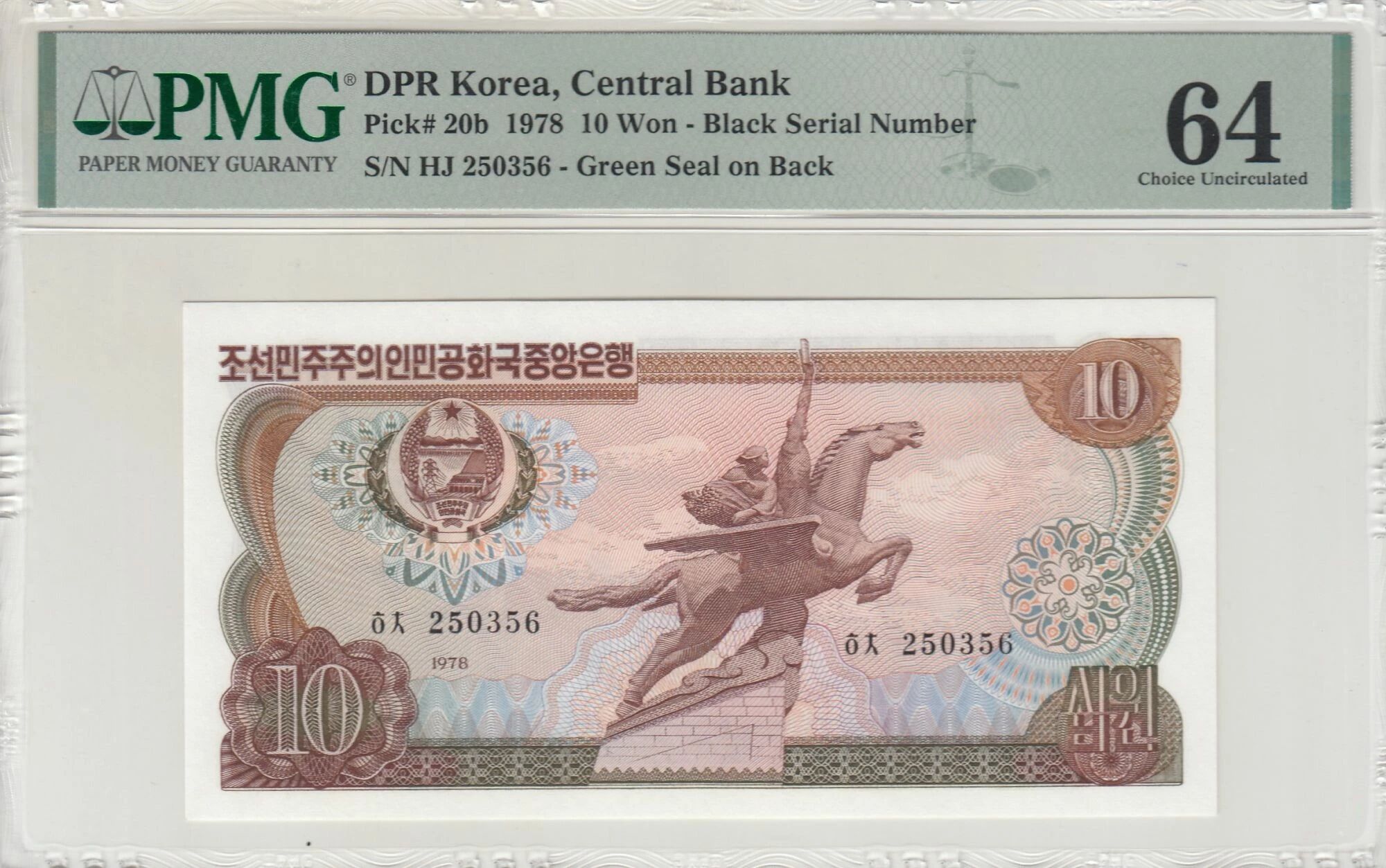 Ce billet de banque nord-coréen a une valeur nominale de 10 wons. Il a été émis en 1978.