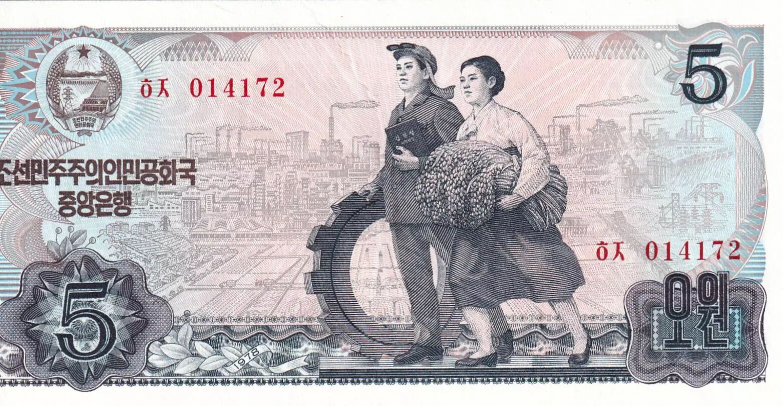 Billet Corée du Nord 5 won - Ouvrier, Paysanne - Mont Gumgang - 1978 - NEUF - P.19c