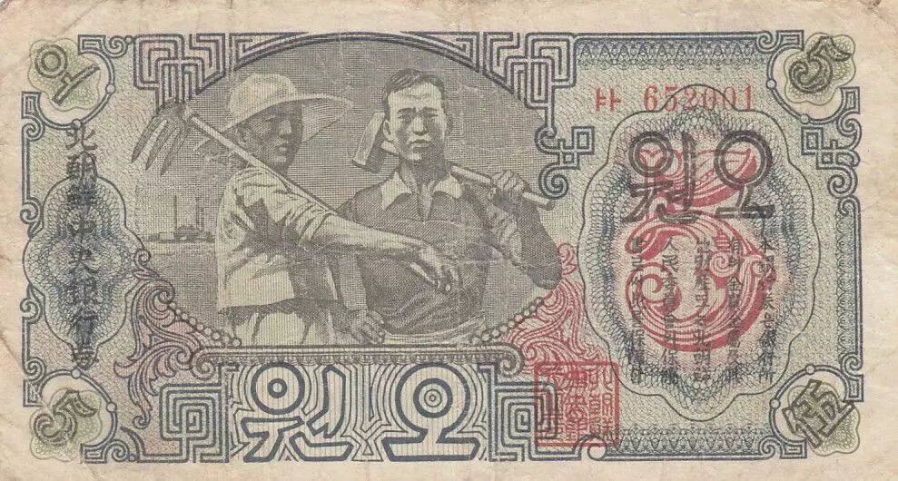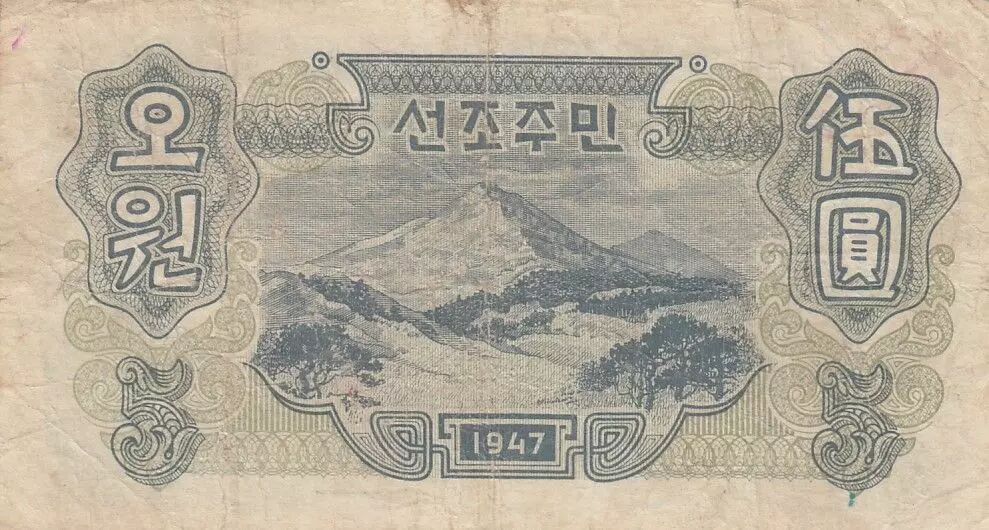 Billet Corée du Nord 5 Won - Travailleurs - Montagne - 1947