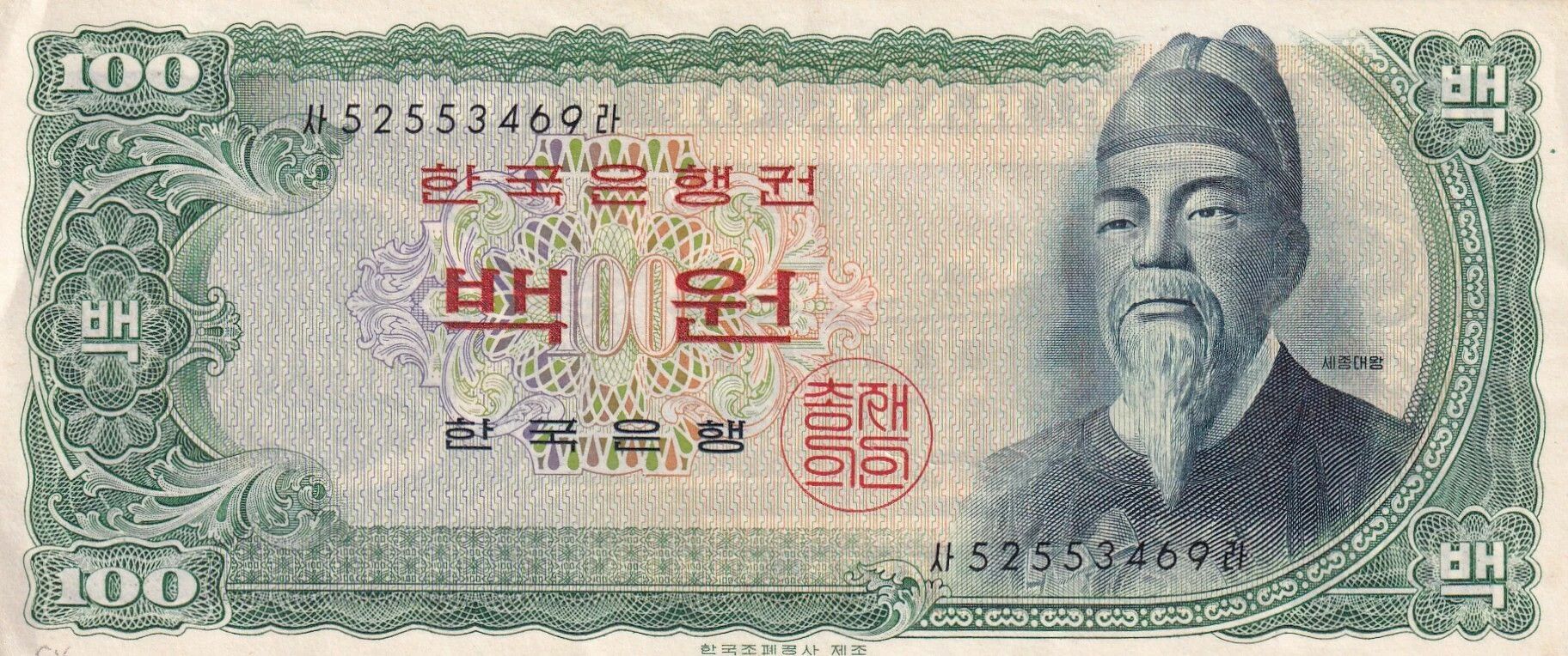 Ce billet de banque, émis en 1953, offre un aperçu des symboles et des valeurs mis en avant par la Corée du Sud à cette période de son histoire. Les inscriptions en Hangeul témoignent de l'importance de la langue et de l'identité culturelle coréenne. Le choix du Roi Sejong le Grand comme figure centrale de l'avers reflète l'admiration pour son rôle dans le développement de l'écriture Hangeul et son impact sur la culture coréenne.