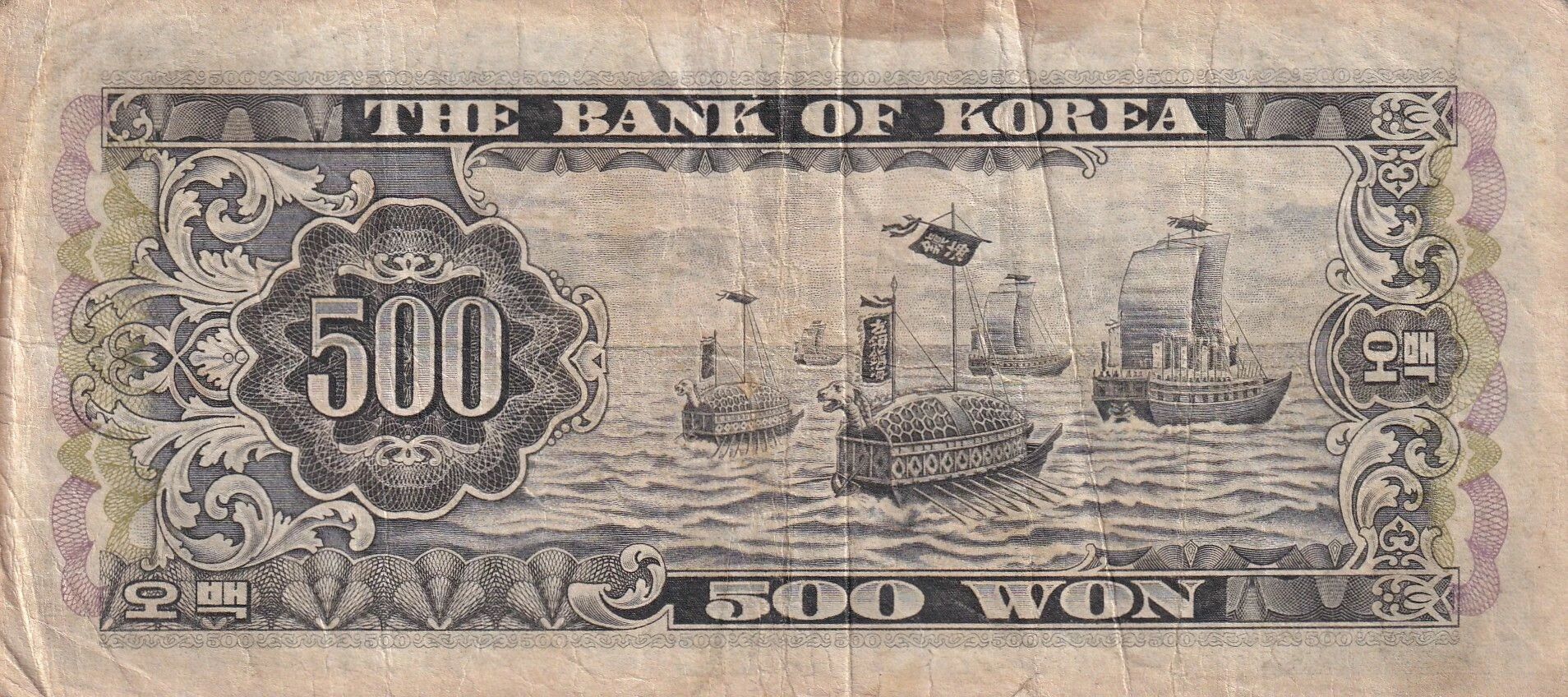Le revers du billet représente un Geobukseon, également connu sous le nom de bateau tortue. Il s'agit d'un type de navire de guerre utilisé par la marine coréenne pendant la dynastie Joseon. Les Geobukseon étaient équipés d'une coque recouverte de plaques de métal et étaient conçus pour être résistants aux attaques ennemies.