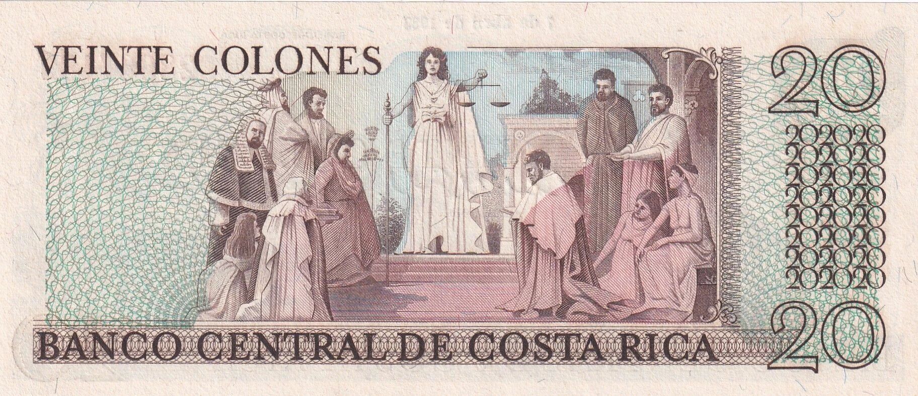 L'avers du billet présente une impression en noir sur un fond multicolore. On y trouve un portrait de Ricardo Jiménez O positionné sur la gauche. Les inscriptions en caractères latins incluent "SAN JOSÉ, COSTA RICA", "CIEN COLONES", "RICARDO JIMÉNEZ O", et "BANCO CENTRAL DE COSTA RICA".