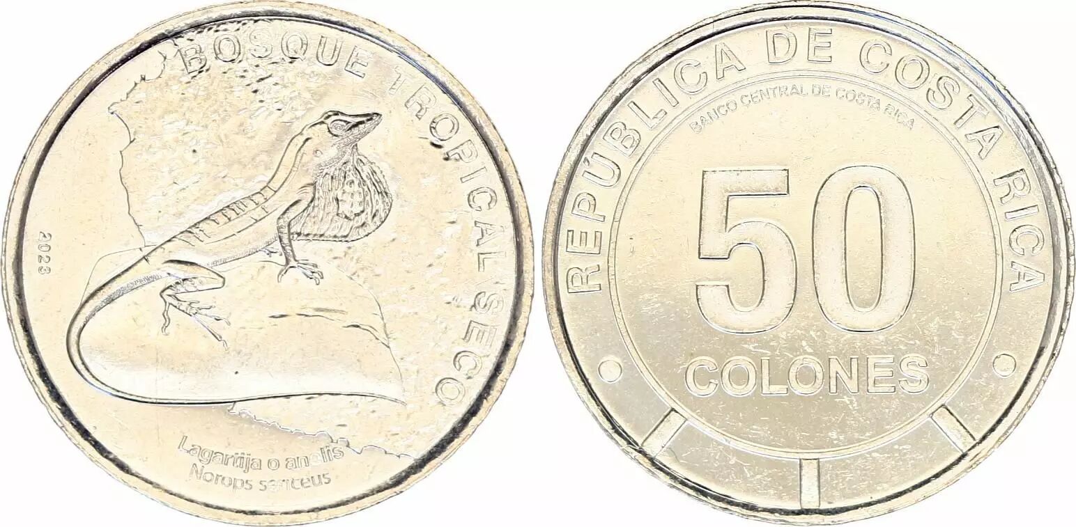 La pièce de 50 colones du Costa Rica, émise en 2023, est une pièce commémorative dédiée à la faune du Costa Rica, plus précisément à l'anole soyeux (Norops sericeus). Fabriquée en acier plaqué nickel, elle pèse 4.4 grammes et possède un diamètre de 24.5 millimètres.