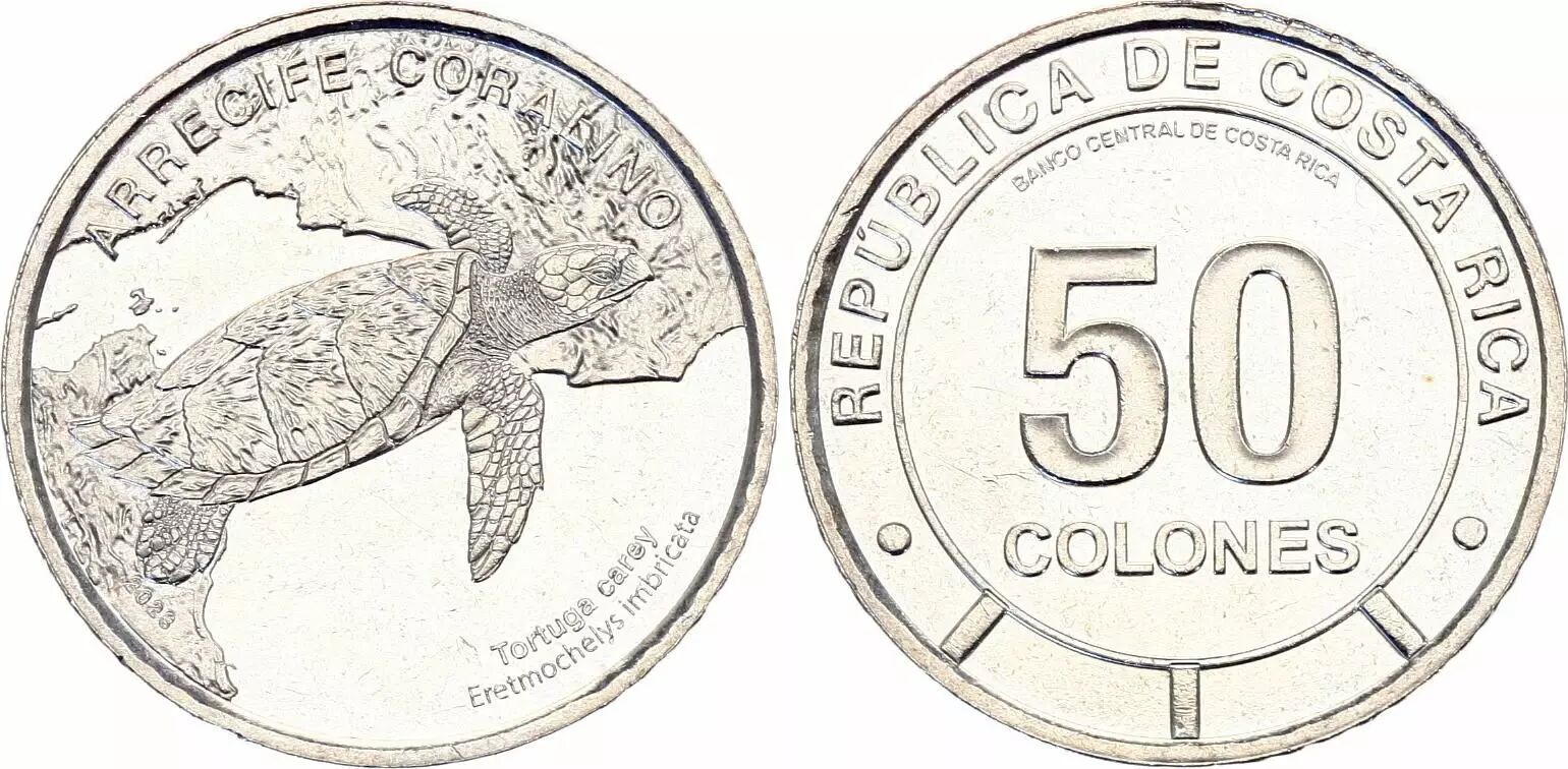 Le revers de la pièce met en scène une tortue imbriquée, également connue sous le nom de tortue caret (Eretmochelys imbricata), placée au centre. Cette tortue est une espèce menacée qui fréquente les récifs coralliens. La légende "ARRECIFE CORALINO" est inscrite en haut, faisant référence à l'habitat des récifs coralliens où cette tortue évolue. En bas, on trouve l'inscription "Tortuga carey Eretmochelys imbricata", précisant le nom commun et scientifique de l'animal représenté. L'année d'émission, "2023", est indiquée sur le côté gauche du motif central.