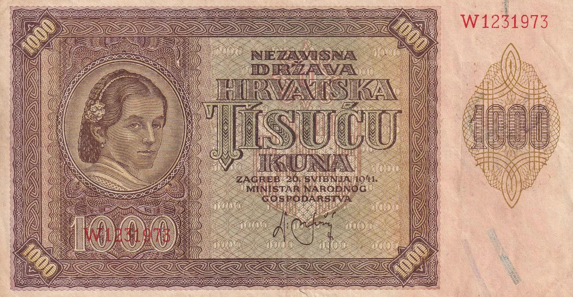 Home > > Croatia 1000 Kuna - young girl - mountains - 1941 - Serial W - XF - P.4