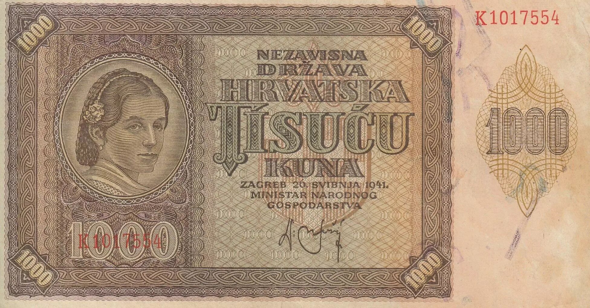 Banknote Croatia 1000 Kuna - young girl - mountains - 20-05-1941 - Serial K